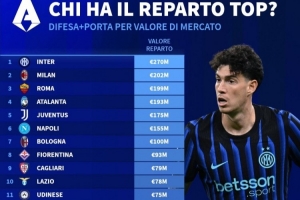 德转列意甲各队防线总身价排行:国米2.7亿欧居首,米兰第二